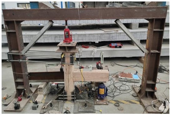 The monotonic loading experiment was conducted in the Heavy Equipment Laboratory of the Jiangsu University of Science and Technology. According to the laboratory space conditions, the reaction frame was erected and fixed to the ground with threaded rods. The base fixing steel plate was positioned according to the diameter of the wooden column, and then the fixing plate was secured to the ground with threaded rods. The specimen column end was inserted between two back-to-back steel plates of the column base, and then the plates and the specimen were tightened and fixed with bolts. Meanwhile, the horizontal displacement of the specimen was restrained by reinforcing the top with a threaded rod and a steel plate to complete the fixation of the specimen. A hydraulic jack with a ten-ton capacity was placed above the specimen column to apply an axial force to the top of the column, and a steel plate was installed between the column top and the hydraulic jack to ensure that the load applied to the column top was uniform. Additionally, a hydraulic jack with a twenty-ton capacity was positioned under the beam end of the specimen to facilitate the application of displacement loads at the beam end, as plotted in Figure 3.