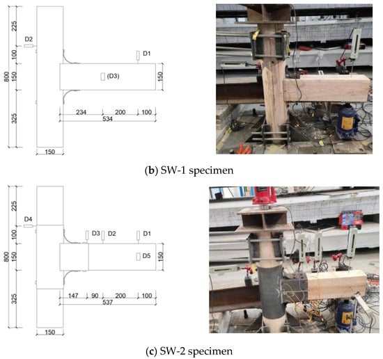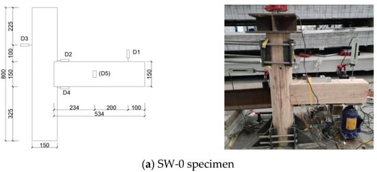 The installation locations of the displacement gauges for the SW-0, SW-1 and SW-2 specimens are shown in Figure 4. The SW-0 specimen is equipped with five displacement gauges. D1, D5 and D3 are used to measure the vertical displacement of the wooden beam, the out-of-plane displacement of the wooden beam and the lateral displacement of the wooden column, respectively. The SW-1 specimen is equipped with three displacement gauges. D1, D2 and D3 are, respectively, utilized to monitor the vertical displacement of the wooden beam, the lateral displacement of the wooden column and the out-of-plane displacement of the wooden beam. Five displacement gauges are installed on the SW-2 specimen. D1 and D2 are used to measure the vertical displacement of the wooden beam, D3 and D5 is severally employed to measure the vertical and out-of-plane displacement of the steel sleeve of the wooden beam and D4 is used to measure the lateral displacement of the steel sleeve of the wooden column.