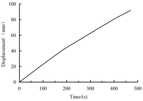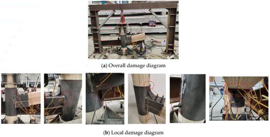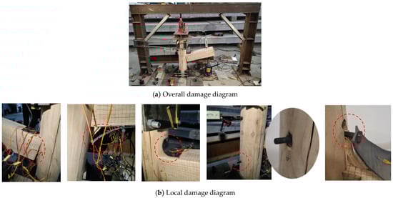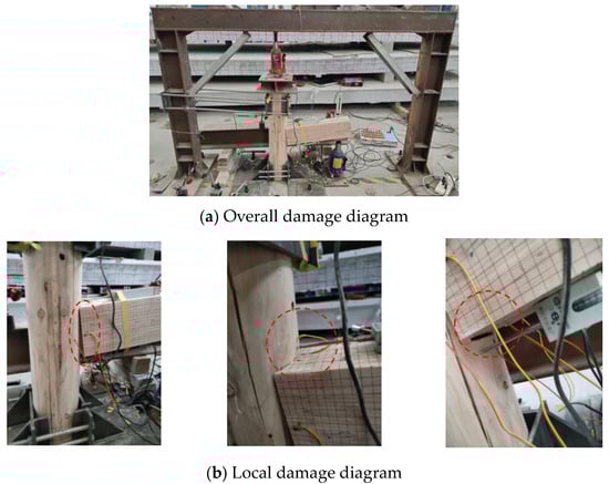 Occasional minor sounds of wood fiber rupture and a loud “dada” sound lasting 2 to 3 s can be heard during the process of loading the displacement to 80 mm, and the specimen was unable to carry the load and was completely destroyed when the vertical displacement reached 80 mm. Therefore, the ultimate load displacement value for the SW-2 specimen was taken as 80 mm. The front end of the steel sleeve on the beam had a severe bulge with a value of approximately 3.5 to 4 mm at that moment, while the internal pressure phenomenon within the wrapping of the wooden beam was intense. The lower side of the steel sleeve on the beam concave upward had a concave value of about 5 to 6 mm, and the degree of tensile deformation of the wooden beam at the lower end of the steel sleeve on the beam also significantly increased, with the tensile deformation amount being approximately 3 to 4 mm. No visible lateral displacement of the column or out-of-plane displacement of the beam was observed throughout the loading process of the specimen, and the final failure mode of the SW-2 specimen is shown in Figure 13.