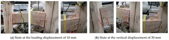 At the beginning of the test, the SW-0 specimen showed no apparent change under minimal load. With the increase in the vertical displacement at the beam end, there was a small compression between the joint and the mortise, accompanied by a “squeaking” sound that lasted for 1 to 2 s and the tenon withdrawal phenomenon of the joint was not obvious at this stage. There was a slight separation between the beam and column of the specimen when the vertical displacement reached 10 mm, along with a minor squeezing phenomenon between the mortise and the tenon, as shown in Figure 6a. This was accompanied by a continuous “squeaking” sound lasting for about 3 to 4 s, and the horizontal distance from the lower edge of the beam to the wooden column at the tenon location was approximately 5 mm at this time. The mutual squeezing action between the mortise and the tenon of the joint gradually intensified when the vertical load was further increased to 30 mm, as plotted in Figure 6b, and the joint emitted a louder “squeaking” sound with each application of displacement load, which lasted for 4 to 5 s.