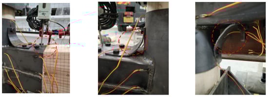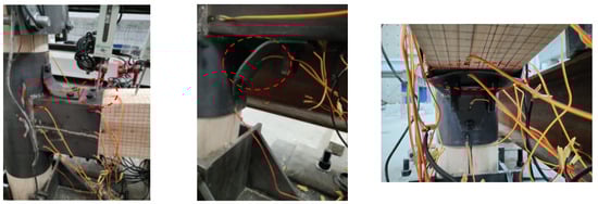 The SW-2 specimen showed no apparent change under minimal load at the beginning of the experiment. Due to the slight gap between the steel sleeve on the beam and the wooden beam, the joint emitted a continuous slight “squeaking” sound for 1 to 2 s as the vertical displacement increased. The beam steel sleeve subjected to vertical compression from the wooden beam and gradually exhibited a slight upward bulging phenomenon during the process of loading the displacement to 10 mm, accompanied by a continuous “squeaking” sound lasting 1 to 2 s. The front edge of the steel sleeve on the beam arose a slight mutual squeezing action with the wooden beam when the vertical displacement reached 10 mm, as shown in Figure 10, which caused a tiny upward bulge of approximately 0.3 mm at the front of the steel sleeve on the beam, and the wooden beam appeared slight compressive deformation. The upper and lower sides of the energy dissipation plate, respectively, exhibited slight bending and stretching. The high-strength bolts connecting the wooden beam and the steel sleeve on the beam primarily bore an upward tensile force along the bolt shaft, which caused the lower side of the steel sleeve on the beam to raise an upward pull, and the small upward indentation with a maximum value of approximately 0.4 mm occurred on the lower side of the beam steel sleeve.