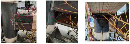 The front end of the steel sleeve on the beam further severely bulged with the bulge value being approximately 1.5 to 2 mm when the displacement was loaded to 50 mm, as plotted in Figure 12, and the internal pressure phenomenon of the wrapped wooden beam was increasingly intensified. The lower side of the steel sleeve on the beam showed the upward concave deformation with the concave value of about 3 to 3.5 mm, and the lower end of the steel sleeve on the column exhibited tensile deformation of approximately 1 to 1.5 mm due to tensile force. Additionally, a noticeable indentation phenomenon occurred at the pressure side corner of the steel sleeve node.