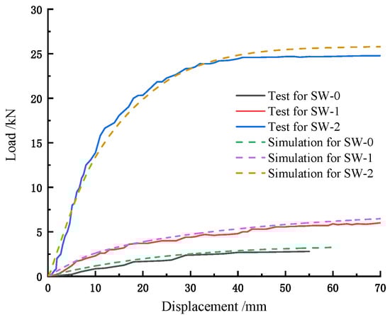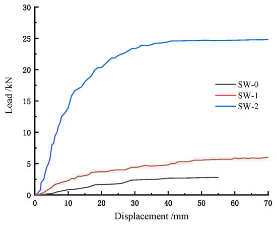 The load–displacement curves of the specimens were obtained by organizing and analyzing the loading displacements and loads for the SW-0, SW-1 and SW-2 specimens, as illustrated in Figure 14.