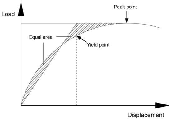 The ultimate load for each specimen was taken as the load corresponding to its final loading displacement. A straight line parallel to the initial elastic slope was drawn on the load–displacement relationship of the specimen, intersecting the curve at two points, such that the area under the curve above the line equals the area above the curve below that line. The load value at which the areas on both sides are balanced was the yield load, as plotted in Figure 15. The comparison of the mechanical properties of the three groups of specimens is shown in Table 4.
