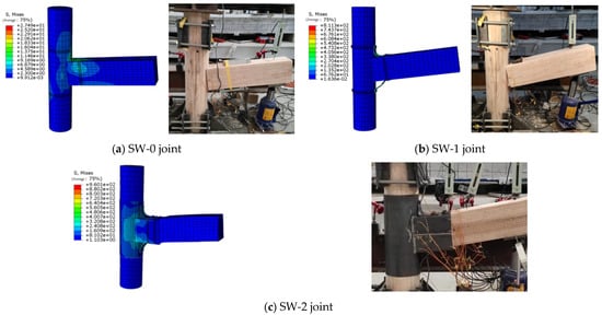 The comparison of failure modes between simulation and experiment for the three groups of joints are illustrated in Figure 16. Figure 17a,b show that the failure modes of the SW-0 and SW-1 joints in both the experiment and numerical simulation are tenon pull-out failures. The amount of tenon pull-out increases gradually with the increase in the vertical displacement load at the beam end. Additionally, the energy-dissipating plates at the upper and lower ends of the SW-1 joint undergo compressive and tensile deformations. Figure 17c reveals that the failure modes of the SW-3 joint in both the experiment and numerical simulation are characterized by the inward deformation of the steel sleeve and the compression failure of the wooden beam. In summary, the finite element simulation results for the three groups of joint models shows respectable agreement with the actual monotonic loading test phenomena.