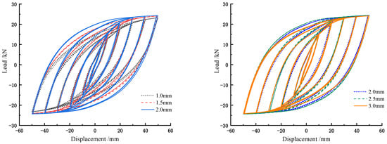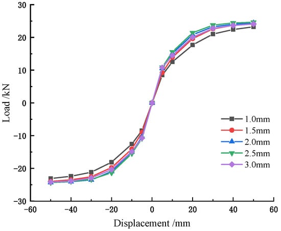 The hysteresis curves of the joints with different thicknesses of energy-dissipation plates are illustrated in Figure 20. The figure shows that the envelope area of the hysteresis curves increases gradually with the increase in the thickness of the energy-dissipation plates, indicating a significant improvement in their energy-dissipation capacity. The ultimate bearing capacity of the joint remains almost unchanged when the thickness of the energy-dissipating plate exceeds 2.0 mm. However, the fullness for the hysteresis curve of joint decreases and the ultimate bearing capacity is reduced when the thickness reaches 3.0 mm. This is because the increase in the weight of structure due to the increased plate thickness, leads to a degradation in the seismic performance of joint. In summary, the optimal thickness of the energy-dissipating plate is 2 mm.
