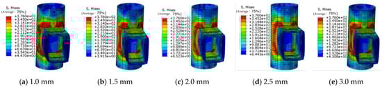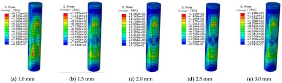 The stress cloud diagrams of wooden columns with different thicknesses of energy-dissipation plates are shown in Figure 22. It can be observed from the figure that the stress of the wooden columns with energy-dissipation plates of 1.0 mm and 1.5 mm thickness covers the entire mortise area, while the stress of the wooden columns with energy-dissipation plates of 2.0 mm, 2.5 mm and 3.0 mm thickness is mainly concentrated on the upper and lower sides of the mortise. Wooden columns with energy-dissipation plates of 1.0 mm and 1.5 mm thickness exhibit slight deformation at the mortise. The deformation of the wooden column mortise becomes almost negligible with the thickness of the energy-dissipation plates gradually increases. This is because thinner energy-dissipation plates have lower stiffness and a weaker capacity to bear internal forces, which requires the wooden columns to bear more of the internal forces. In contrast, thicker energy-dissipation plates have greater stiffness and can withstand larger internal forces without yielding or breaking, which results in less deformation for the wooden columns.