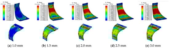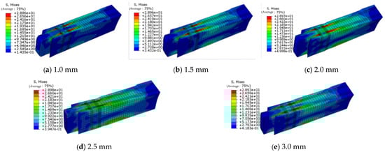 The stress cloud diagrams of wooden beams with different thicknesses of energy-dissipation plates are illustrated in Figure 23. It can be observed from the figure that the high-stress areas and deformation on the upper and lower flanges of wooden beams with 1.0 mm and 1.5 mm thick energy-dissipation plates are relatively small. When the thickness of the energy-dissipation plates increases to 2.5 mm, large areas of high stress appear on the upper and lower flanges of the wooden beams, and the deformation also becomes increasingly severe. The areas with high stress on the upper and lower flanges of the wooden beams become relatively small when the thickness of the energy-dissipation plates reaches 3.0 mm. This is because thinner energy-dissipation plates have lower stiffness and a weaker capacity to bear internal forces, which require the wooden beams to bear more of the internal forces. In contrast, thicker energy-dissipation plates have greater stiffness and can withstand larger internal forces without yielding or breaking, which reduce stress concentration and deformation. The thickness of the energy-dissipation plates was further increased to enhance the restraining effect of the plates on the wooden beams, and the increase in stress concentration and deformation was suppressed to a certain extent. However, the impact of the plates on both the overall and local stiffness of the wooden beams may have reached saturation due to the thickness of the energy-dissipation plates is thicker. Therefore, the reduction in stress and deformation is relatively small.