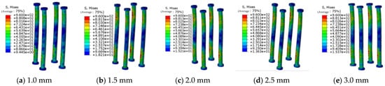 The stress cloud diagrams of high-strength bolt with different thicknesses of energy-dissipation plates are plotted in Figure 26. It can be observed from the figure that as the thickness of the energy-dissipation plates gradually increases, the stress concentration and deformation around the upper and lower threads of the high-strength tension bolts become more severe. This is because the contribution of the plates to the overall stiffness of the structure also increases with the thickness of the energy-dissipation plates, and the connection areas of the bolts are subjected to greater stress under the same external forces. Additionally, the load transfer path within the structure may be altered by the thicker energy-dissipation plates, which leads to more load being transferred through the bolts, causing greater stress concentration and deformation in the upper and lower thread areas of the bolts. In actual structures, threads can increase local stress, especially in the area where the bolt contacts the connecting components. Since the threads of high-strength tension bolts are ignored in numerical simulations, the simulation results of the stress levels, stiffness and strength of the bolts in these areas may be underestimated, thereby affecting the stiffness and deformation behavior of the entire joint. Although the details of the bolt threads were ignored in this study, such simplification is reasonable in the preliminary analysis stage, especially when it comes to the evaluation of the overall structural performance.