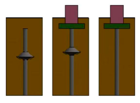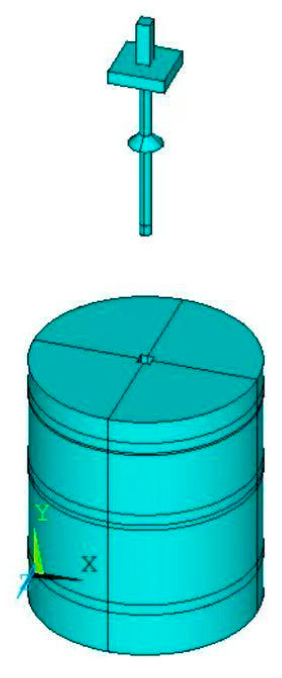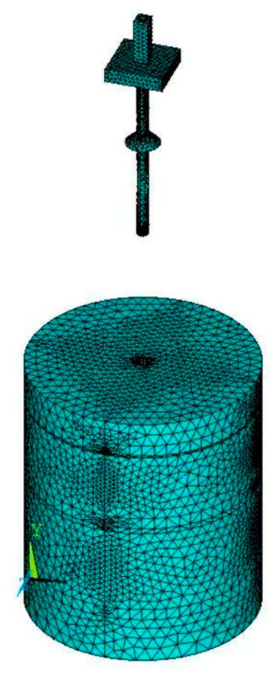 The ANSYS APDL program’s modeling interface is used for this simulation. Based on the data in Table 1, the key points (Keypoints) for the CEP pile shaft are created, and these points are used to form a closed plane. The plane is then rotated 360° around its axis of symmetry to generate the CEP pile shaft model. The cap is created using the Volumes-Block interface, where a cube is first generated, followed by a rectangular column with dimensions of 300 mm in length and width, and 1500 mm in height. A Boolean operation is applied to subtract the 100 mm portion of the pile head that connects the CEP pile and the cap. The cap and the CEP pile shaft are then merged into a single entity using another Boolean operation. The soil modeling process is similar to that of the pile. The low-cap CEP single pile–soil model is shown in Figure 4.