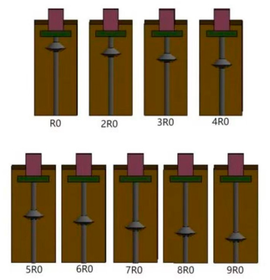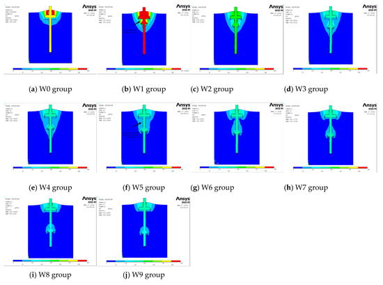 In the course of the research, precise extraction procedures were employed to obtain the Y-direction pullout displacement contour maps for the W0 to W9 groups under a 2300 kN load. For a more detailed and comprehensive comparative analysis, the side half-sectional views of the pile foundation were carefully selected. This approach facilitates a focused study and discussion of these contour maps from a specific perspective, aiming to reveal key insights into the pullout performance of the pile foundations, as shown in Figure 10a–j.