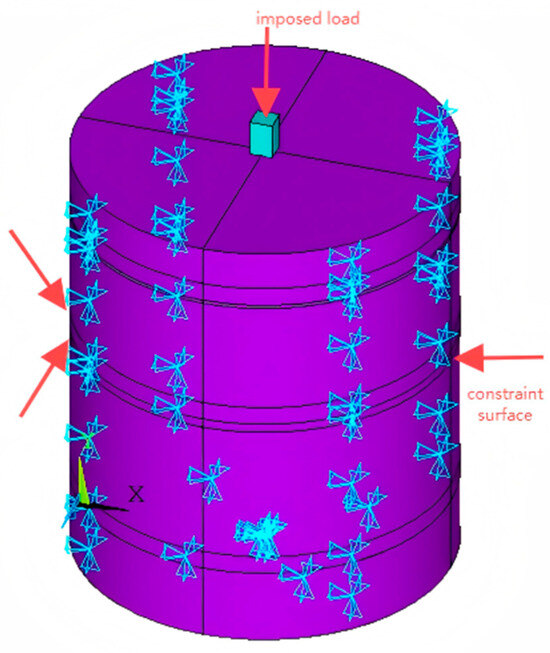 In this simulation, the soil model is considerably larger than the low-capacity CEP single-pile foundation, and as such, the influence of boundary conditions on the results is relatively minimal. Boundary constraints are applied to the degrees of freedom at the edge surfaces of the soil model. Since the loading direction in this study is vertical tensile force, all surfaces of the soil model—except the top surface—have their degrees of freedom constrained in the X-, Y-, and Z-directions. The vertical load is applied incrementally: each loading step increases by 100 kN compared to the previous one, and the loading continues until the ANSYS simulation curve fails to converge, at which point loading is halted. The process begins by converting the concentrated force into a surface load, which is then applied. A schematic diagram illustrating the boundary conditions and load application is provided in Figure 6.