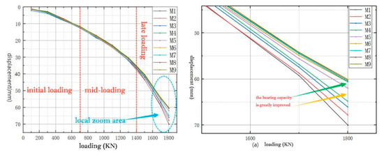 By comparing the pile head load–displacement curves of each model group in Figure 7 and Figure 7a, the following conclusions can be drawn:
