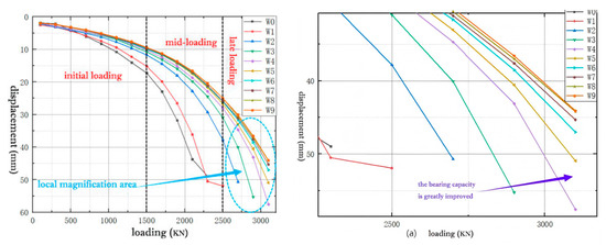 - During the initial loading stage, from 0 to 1500 kN, the slopes of the curves for all groups are relatively small, indicating that, at this stage, displacement increases only slightly as the load is applied, and the structure remains in the elastic phase. The trends of the W0 and W1 groups are similar, while the trends of the W2 to W9 groups exhibit a similar pattern. This suggests that, in the early loading stage, differences in load–displacement responses start to emerge between the different groups;