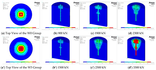 Through specialized extraction procedures, the pullout load–displacement contour maps for the W0 and W5 groups under different loading conditions were obtained. For a more detailed and comprehensive analysis, the side half-sectional views of the pile foundation were specifically selected, with the corresponding illustrations provided in Figure 9b–d,b’–d’.