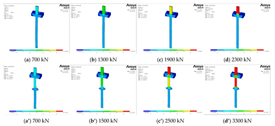 Shear stress contour maps for the W0 group low-capacity bored cast-in-place pile foundation and the W5 group low-capacity CEP single-pile foundation under various vertical tensile forces were extracted. Additionally, side half-sectional views of the low-capacity pile foundations were selected for comparative analysis. The corresponding illustrations are presented in Figure 11a–d,a’–d’. This approach allows for a more intuitive observation of the distribution and variation of shear stress at different loading stages for both foundation types, providing a solid foundation for further analysis of their mechanical behavior.