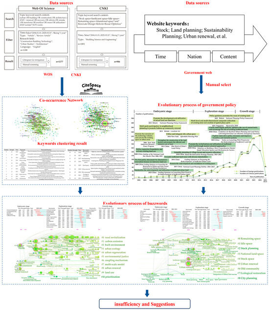 The methodology employed in this study for the analysis of the knowledge network map and the spatial–temporal evolution of inefficient stock space is illustrated in Figure 1. The pertinent literature and policy information were sourced from the CNKI and WOS databases, as well as various governmental websites, to establish a foundational text database. It should be noted that the literature from the WOS database and CNKI database was initially selected using three criteria, namely subject terms, research fields, and publication dates. Before finalizing the text database, it should be manually reviewed again based on the abstracts and titles. After that, the textual data from the WOS database, CNKI database, and governmental websites were exported to RIS format and RefWorks format, respectively, and entered into CiteSpace 6.3.R1 software. These data included the literature title, author, institutions, and abstract text information, which were processed using utilities to address de-emphasis. Based on the processed text data, the co-occurrence network will be obtained by using the G-index selection criteria in CiteSpace software, and the spatial–temporal evolution process map also could be obtained by using the Timeline Layout and Burrstones Option functions. Furthermore, the spatial and temporal evolution of inefficient stock space within the CNKI and WOS databases was derived by integrating this analysis with the policy evolution processes of various governmental departments. Based on the findings from this research, appropriate recommendations are proposed for the future development of inefficient stock space.