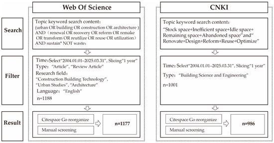Considering the geographical influence of language on the research literature regarding inefficient stock space, the Web of Science (WOS) database, which predominantly features English-language publications, was chosen as the primary source. Additionally, China is one of the countries with the highest number of megacities, many of which are currently in development or renewal; the China National Knowledge Infrastructure (CNKI) database, which includes the Chinese literature, was selected as a supplementary source. The investigation into inefficient stock space encompasses a variety of keywords and spans an extensive temporal range. In the process of reviewing the literature, this study meticulously filters relevant publications from the CNKI and WOS databases, as illustrated in the data collection processing presented in Figure 2, the asterisk (*) in this figure represents any sequence of characters. The findings indicate that research on inefficient stock space can be traced back to 2004 within the CNKI database. To facilitate a comparative analysis of the spatial and temporal evolution of the two types of the literature, the search parameters for both the CNKI and WOS databases were established to cover the period from 1 January 2004 to 31 March 2025, aligning with the timeline for urban inefficient stock space studies. Additionally, after reviewing these articles on stock space from WOS and CNKI databases, significant keywords pertinent to urban inefficient stock space, such as “stock space”, “inefficient space”, and “idle space”, were employed, with the disciplinary focus set on architecture and engineering sciences. Subsequently, CiteSpace’s built-in de-duplication feature, along with manual screening, selected a total of 986 relevant publications from the CNKI database and 1177 from the WOS database. These publications were utilized for the spatio-temporal analysis and visualization of urban inefficient stock space evolution presented in this paper.