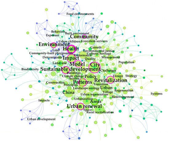 An analysis of 1177 scholarly articles concerning the research on inefficient stock space within the Web of Science (WOS) database has yielded a keyword co-occurrence knowledge map, as illustrated in Figure 4. The figure results shows that the frequency ranking of keywords in the research papers from the WOS database is as follows: City, Rural revitalization, Urban, Areas, and China. For the keyword centrality, the ranking from highest to lowest is Health, Community, Impact, Environment, and City. In comparison to the findings from the CNKI database, the literature derived from the WOS database predominantly highlights a diversified approach to the research on inefficient stock space. It should be noted that over half of the keywords are concerned with specific areas and locations, signifying a transition in research topics from traditional analyses of residual urban spaces to investigations of the urban–rural coupling mechanisms. This change emphasizes the activation of the potential of inefficient stock spaces in rural and township areas as emerging focal points for future research. Furthermore, the prominence of the keyword “China” in the frequency statistics indicates that the literature on inefficient stock space within the WOS database significantly incorporates contributions from Chinese scholars. However, the results of keyword centrality statistics are different, as these studies propose strategies that focus on enhancing the utilization of inefficient stock space in both urban and rural contexts from multi-dimensional and multi-level perspectives.