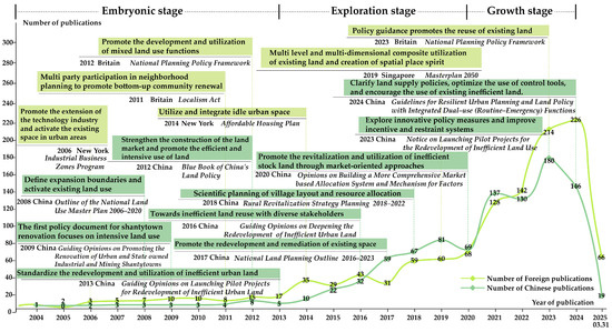 - Growth stage (2020 to the present): Notable initiatives include Singapore’s Draft Master Plan 2025 and China’s 2023 Circular on the Ten-Point Work for the Redevelopment of Low-Use Land. With comparing the variances in different land stock patterns, governments have integrated concepts of spatial resilience and urban well-being to improve the long-term sustainability of urban communities [53] and enhance the overall quality of life [54]. Concurrently, governments are implementing innovative policy measures focusing on optimizing the use of inefficient urban spaces [55]. Moreover, the investigation of urban inefficient stock has emerged as a prominent research focus. Researchers are increasingly engaging in research of inefficient stock space with multidisciplinary theories and are utilizing a variety of theoretical frameworks to develop more scientifically informed and rational strategies for the effective utilization of stock spaces. Consequently, there has been a marked increase in the related scholarly literature, escalating from an average of approximately 10 articles per year to nearly 300.