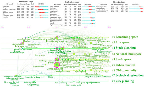 A clustering analysis was conducted on the keywords from 986 research papers pertaining to inefficient stock space research within the CNKI database. The cluster module value was Q = 0.6675, and the average profile value was S = 0.8554, which means the clustering results are reliable. The cluster ranking number, strength, keywords, buzzwords, and hotspot years are presented in Table 1. Notably, the year 2018 exhibited the highest clustering scale, primarily focusing on the concept of remaining space. These research papers from the CNKI database concern the topics of emphasizing the utilization of remaining or idle space within existing structures. Furthermore, the efficacy of sustainable adaptive reuse strategies in fostering regional development also becomes another hot topic [18]. In conclusion, the classification of topics within the CNKI papers can be delineated into two primary categories, namely spatial optimal design and planning, as well as planning and development mechanisms, based on the attributes of the keywords and buzzwords (top five).