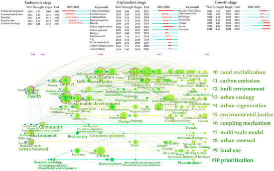 - Lastly, the category pertaining to urban and rural development planning comprises three clustering keywords as follows: #0 Rural Revitalization and #10 Prioritization. The center values of the top five buzzwords of these keywords are 0.99 and 0.04, respectively. Due to the limited research on inefficient stock space in rural areas, there has been a trend towards a single center. There exist considerable disparities in demand between urban and rural regions, resulting in notable variations in functional configurations when compared to purely urban or rural environments. The optimization of space utilization at urban–rural interfaces has emerged as a crucial element in enhancing the efficiency of inefficient stock space. Developed nations have experienced significant urbanization prior to China; the international literature has primarily examined urban–rural development planning through social [45], institutional, and economic benefits [46]. Central themes of this analysis include the drivers of urban–rural development models and the associated regional economic benefits. It should be noted that citizen science has significant potential to enhance both research and policymaking. This approach facilitates a comprehensive consideration of various factors, including regional culture, religion, and history [47]. Additionally, it promotes sustainable urban development and fosters a just social environment [48]. Furthermore, within the framework of comprehensive urban renewal, research advocates for the implementation of innovative decision support systems that focus on refining and optimizing renovation strategies for existing urban spaces. These systems offer guidance to policymakers regarding decision-making models [49] and investigate the impact of macro-level factors on the promotion of sustainable urban development.