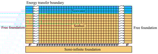 When a tunnel is in the environment of seawater or groundwater, the interaction between the dynamic characteristics of the water and the tunnel structure affect the long-term stability and safety of the tunnel. In particular, the pressure and temperature of seawater changes because of the depth of seawater or seasonal changes, which in turn affects the tunnel structure along with the permeability and mechanical conduction characteristics of the soil layer. Dynamic effects such as tides and waves periodically affect the tunnel structure and the surrounding soil layer. In the soft soil layer, because of the low bearing capacity of soil, the interaction between water and soil may lead to the settlement of the tunnel. In the interaction between soil and the tunnel structure, fluid–solid coupling mainly affects the mechanical properties of the soil and the stability of tunnel structure. This is because changes in fluid pressure and flow rate lead to the deformation of, and a reduction in the shear strength of, the soil, thus affecting the tunnel structure. In research and analysis, scholars often use the finite element method to discretize tunnel structures and the surrounding soil into small elements, solving for each element to obtain the distribution of variables such as strain within the tunnel framework and adjacent soil. The boundary element method is commonly used to discretize the fluid boundary of the submarine tunnel to deal with the unbounded domain problem. In this paper, the SuperFLUSH/2D software of Jishin Kogaku Kenkyusho, Inc. (Tokyo, Japan) was used to analyze the fluid–solid coupling problem between seawater and the soil layer. The interaction between seawater and the seabed is illustrated in Figure 2. The SuperFLUSH/2D software demonstrates superior capabilities in fluid–solid interaction analysis, with its principal advantages manifesting in four key aspects: (1) When the software performs fluid–solid coupling analysis, it can simulate the interaction of soil and structure at the same time. (2) The software can more truly reflect the deformation and failure of nonlinear soil under seismic load, thus providing more accurate analysis results. (3) The software can flexibly set complex boundary conditions and loading methods. (4) The software has efficient computing performance and a wide range of application scenarios.