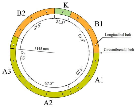 Based on a certain nuclear power project located along the southeastern coast of our country, a safety-grade water intake shield tunnel will be constructed. The planned inner diameter of the water intake tunnel is 6200 mm, with a segment thickness of 0.45 m, a total length along the tunnel axis of 984 m, and a bottom elevation ranging from −17.5 m to −28.5 m. The tunnel will be built with a natural foundation and shield technique, and the soil on the top of the pipe will be about 10 m. The tunnel lining will be made of precast reinforced concrete segments with a ring width of 1.2 m. Each ring will be assembled by staggered joints of 6 segments. There will be 16 longitudinal bolts between the ring and the ring, connected by straight bolts, and 12 ring bolts between the segments, connected by bent bolts. The tunnel’s cross-section is illustrated in Figure 3.
