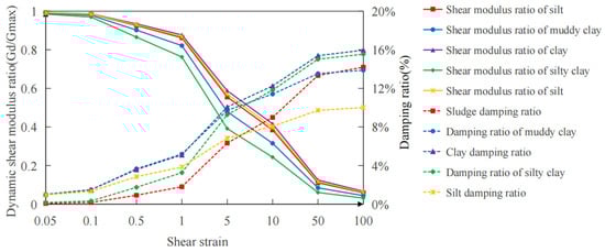 The modulus ratios and damping ratios of the soil at the seabed tunnel site.