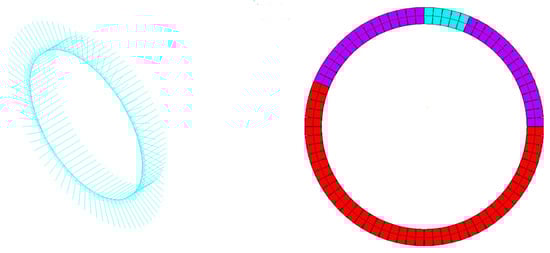 In this study, a lateral beam–spring framework for the shield tunnel was employed to conduct a simulation. In this analysis, the built-in Beam188 element of ANSYS was employed to simulate the shield segments, and the Combin14 element was employed to model the joints with various degrees of freedom. Six joint springs were set according to the joint parts of the ring assembly segments, and the lateral analysis model is depicted in Figure 8.