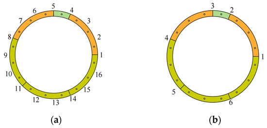 Schematic diagram of location numbers of monitoring points of tunnel lining segments. (a) The monitoring position of the deformation rate of the lining segment’s diameter; (b) the monitoring position of the lateral joint-opening amount of the lining segment.