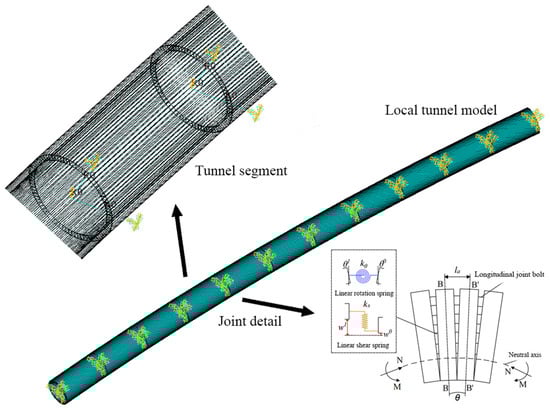 The overall length of the model was 984 m, consisting of 820 segments, among which a partial model of the tunnel is depicted in Figure 10. According to the investigation results of the water intake project for the nuclear power plant, combined with the Code for Seismic Design of Urban Rail Transit Structures [] and the Standard for Seismic Design of Underground Structures [], the seismic performance calculation conditions of shield tunnel joint were determined. In order to better represent the relationship between the joint-opening amount and the longitudinal foundation position with the response displacement method, the stiffness coefficient of the spring between the longitudinal rings was calculated according to the stiffness combinations of the three kinds of bolts set in Table 2.