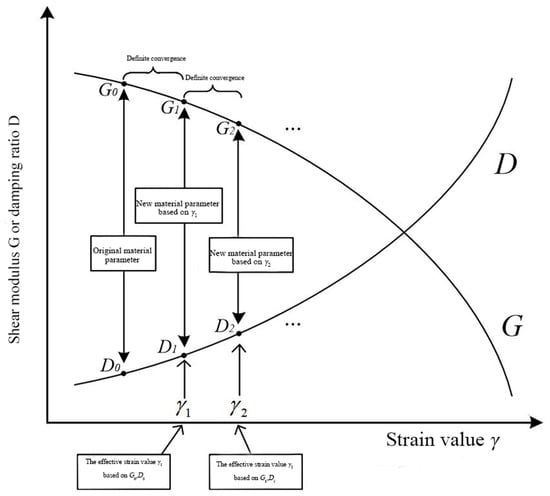 In dynamic analysis, it is essential to account for the nonlinear material characteristics of the soil. From this point of view, the free-field model of the site along the shield tunnel was established through the SuperFLUSH/2D program for equivalent linear analysis, and the nonlinear issue was converted into a linear one by employing the equivalent linear approach. The principle of the equivalent linear method is that the elastic analysis is carried out in each step of the calculation, but the soil modulus and damping ratio change nonlinearly according to the specified mode in the whole time history analysis process. The critical aspect of using the equivalent linearization approach is determining the effective shear strain of the soil mass. First, an equivalent shear strain is defined according to the material characteristics for a dynamic analysis. Subsequently, as shown in Figure 11, a revised equivalent shear modulus and damping ratio of the soil mass are derived based on the G~γ and D~γ curves in order to account for the nonlinear behavior of the soil mass. The longitudinal analysis model of the global site of the shield tunnel is shown in Figure 12. The damping boundary was placed at the base of the free-field configuration and along both lateral edges, and the ground motion was input in the form of equivalent nodal force. The relative displacement of the soil layer in the global frame of the submerged tunnel was then obtained through nonlinear seismic response analysis.