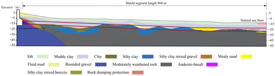 The Circum-Pacific seismic belt in the coastal area of China is one of the two major seismic zones in the world, which makes it particularly important to research the seismic performance of underwater shield tunnels under inhomogeneous geological conditions. Chen et al. [] combined viscoelastic artificial boundaries and applied the ANSYS 19.1 software to establish a model that can simultaneously consider the interaction between the soil–water medium and structural dynamics. They conducted lateral seismic analysis on vertical shaft structures in soft soil and rock foundation. The results demonstrated that despite varying soil conditions, the shaft structures followed consistent patterns in internal force distribution and deformation, with the joints experiencing the most significant seismic effects. Ding et al. [] analyzed the various effects of bidirectional seismic waves on the internal force and deformation of the tunnel cross structure. The findings demonstrated that the effective stress of the soil layer at the top of the tunnel was greatly reduced during the earthquake. In order to prevent the main structure from floating up, it was suggested to strengthen the overlying soil layer. Yu et al. [] used the dynamic time-history response analysis method and pseudostatic method to analyze the seismic performance of a tunnel under various rock mass criteria. The internal force and deformation characteristics of tunnels were different when they passed through different strata. When the tunnel was in the upper soft and lower hard strata, the internal force was the largest and the deformation was not uniform, while the internal force under the homogeneous rock stratum was the least. Wu et al. [] conducted a numerical analysis to research deformation in shield tunnel construction under soft upper and hard lower geological conditions in coastal areas. Hard rock strata demonstrated significantly better settlement control characteristics than soft rock formations. In coastal tunnel engineering, hard rock excavation is generally preferred, where maintaining proper geostatic pressure equilibrium is crucial to avoid both settlement and heave. It should be noted that while grouting pressure plays an essential role in achieving complete fissure filling, excessive pressure does not proportionally enhance settlement control effectiveness. Yang et al. [] researched tunnel inclination and discovered that tunnels exhibited a linear relationship with the tunnel inclination angle. In the seismic design of a shield tunnel, the inclination of the tunnel can be considered to evaluate the internal force change caused by earthquakes so as to improve efficiency. Chang et al. [] proposed a new model of joint and proved through research that this joint performed well under complex geological conditions, with advantages of reducing the joint-opening amount and improving the rotational stiffness of the joint. Currently, research on submarine tunnels is relatively abundant [,,]; however, studies that consider the coupling effect of seawater and the seabed remain scarce. Liu et al. [] established a model of the seawater–soil–tunnel structure and compared the seismic performance of a submarine tunnel under distinct buried depths under the action of dead water and flowing water. The analytical results demonstrated a consistent trend where the tunnel’s structural stress and horizontal displacement diminished progressively with increasing burial depth; this was accompanied by a corresponding decrease in the dynamic water pressure influence coefficient. Cheng et al. [] adopted the finite element software ADINA V9.7.1 to simulate the earthquake response of an undersea tunnel under bidirectional seismic action. Chen et al. [] experimentally validated a fluid–structure coupling approach, revealing that subsea tunnels are more vulnerable to low-frequency seismic excitations when considering seawater–seabed interactions, with seismic damage mitigation observed at greater water depths. He et al. [] summarized the characteristics and applicability of common seismic calculation methods for shield tunnels. Zhou et al. [] invented a new meshfree method that takes into account crazing, touch behavior, and fluid–solid effects and applied the research method practically in the construction of karst tunnels. Huang et al. [] considered the fluid–solid interaction effect and the effect of overlying seawater pressure on underwater tunnels and analyzed the seismic response rules and damage evolution processes under different ground motion excitations. Chen et al. [] proposed a seawater–seabed–tunnel model and found that low-frequency ground movement had a greater influence on the submarine tunnel and that tunnel damage decreased with water depth. Li et al. [] conducted a systematic investigation to enhance the prediction accuracy of formation seepage pressure in slurry shield tunnels. Their results demonstrated that under fluid–solid coupling conditions, rock strata exhibited the most extensive seepage pressure disturbance range under identical grouting pressures compared with relatively smaller ranges in sandy and clay layers. The calculated seepage pressure was consistent with the measured value, which verified the rationality of the revised formula. Jiang et al. [] developed a three-dimensional seawater–seabed–segment coupled model to investigate the dynamic response characteristics of subsea tunnels subjected to lateral seismic excitation. The findings revealed that the connection between the mid-partition and head junction was most vulnerable to initial damage and that the arch segment sustained the most severe postearthquake damage, suggesting these critical zones require special design considerations. Chen et al. [] conducted a study on the nonlinear seismic response of tunnel joint lining and compared the research results with dynamic analysis via the three-dimensional finite element method. It was shown that