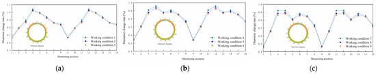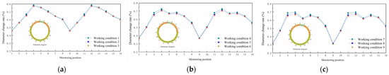 Section 1: diameter change rate of the lining tube under different bolts. (a) M24 bolt; (b) M30 bolt; (c) M36 bolt.