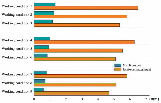 Maximum joint-opening and misalignment amounts of the longitudinal joint of the lining segment under different working conditions.