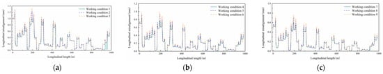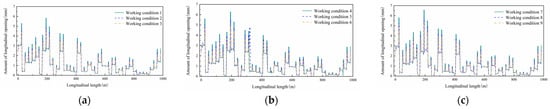 Variation curve of misalignment of the longitudinal joint of the lining segment under different working conditions. (a) M24 bolt; (b) M30 bolt; (c) M36 bolt.