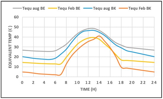 Based on the climatic data from Meteonorm, the daily average ambient temperature and solar radiation (G) are obtained; subsequently, the equivalent temperature is calculated daily. Figure 2 depicts the equivalent temperature for Beirut and Bekaa in August (Tequ aug BE and Tequ aug BK) and February (Tequ Feb BE and Tequ Feb BK), respectively. The graph shows clearly that the temperature fluctuations during the day in Bekaa are more noticeable, indicating larger diurnal temperature variations than in Beirut.