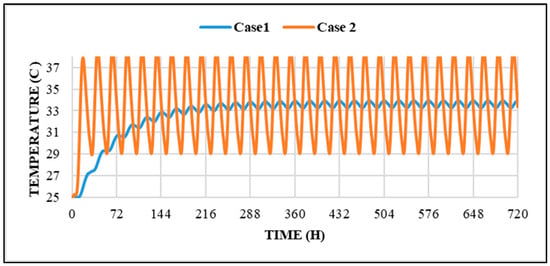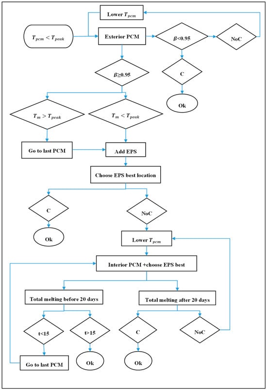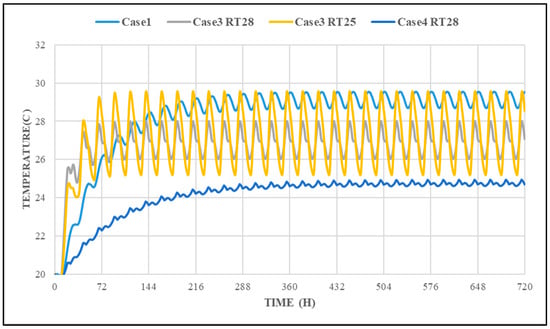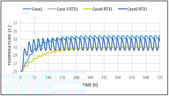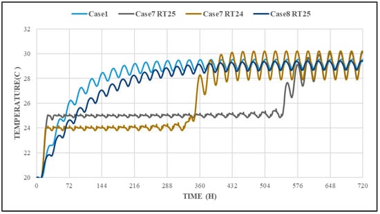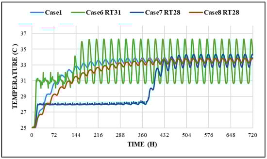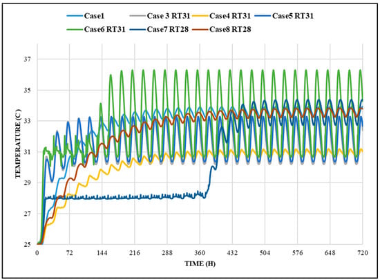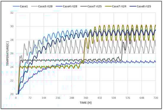 Additionally, PCM phase-change temperatures in reviewed studies were selected based on indoor comfort, outdoor conditions, or nighttime ambient temperatures during summer []. However, our study introduces a methodology for selecting PCM temperatures beginning from a value lower than the indoor temperature of a conventional case.