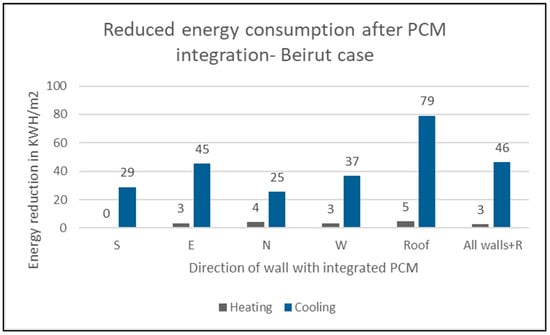 Reduced energy consumption in (KWH/m2) for Beirut case after PCM integration.