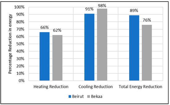 By comparing the percentage reduction in energy demand achieved by integrating PCM into the building envelope in Beirut and Bekaa, as illustrated in Figure 15, the following observations were made: