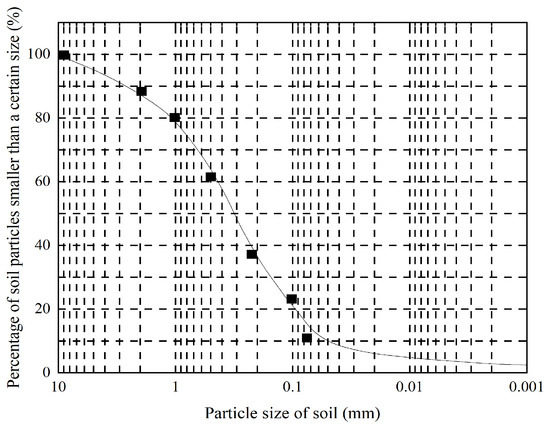 Particle Size Grading Test: The air-dried soil sample is sieved through a 2 mm sieve, and according to ASTM D6913-17 [31], the distribution characteristics of different particle sizes of alluvial silt sand are clarified, that is, the particle size distribution of soil. The analysis results are as follows Table 1 and Figure 2: