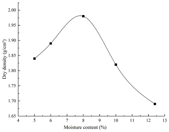 Compaction Test: The standard Proctor compaction method (ASTM D698-12 [33]) has a compaction energy of 600 kN∙m/m3 and is compacted in 3 layers, with 25 blows per layer. As shown in Figure 3, dry density varies with changes in moisture content. The dry density of the soil sample reaches its peak value at a moisture content of 7.8%.