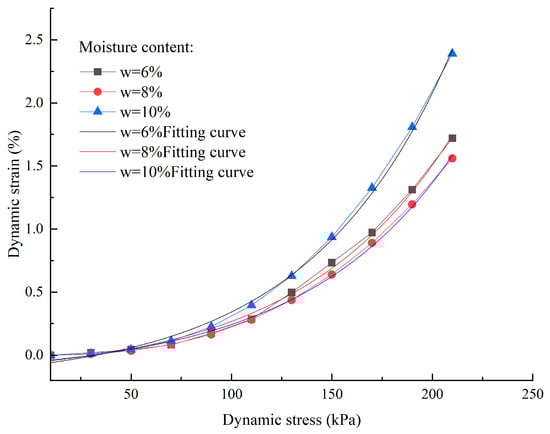 In the equation, is the dynamic stress, is the dynamic strain, and a and b are fitted material constants. Similarly, Wang et al. [36] investigated the creep characteristics of coral sand and proposed a dynamic constitutive model suitable for granular materials, offering significant insights into the mechanical behavior of alluvial silty sand under dynamic loads. Table 3 shows the values of these parameters and under different test conditions. Taking moisture content as an example, under the condition of a constant confining pressure of 50 kPa, the fitting curve of the dynamic stress–strain curve is shown in Figure 5. The curves demonstrate the consistent accuracy of the hyperbolic model (R2 > 0.95) across different saturation conditions.