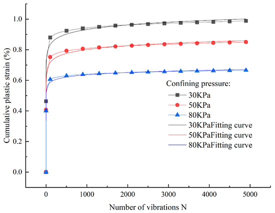 In the formula, A and B are the material constitutive parameters obtained by fitting the experimental data, and the parameters and R2 obtained under different experimental conditions are shown in Table 4. Keeping the moisture content and loading frequency constant, the curve fitting method of Formula (4) was used to obtain the dynamic elastic modulus–dynamic strain fitting curves under various confining pressures, as shown in Figure 6. The analysis shows that the R2 values under different test conditions are all greater than 0.95, and the visual verification of the curve in Figure 6 confirms that the fit obtained is relatively reliable.