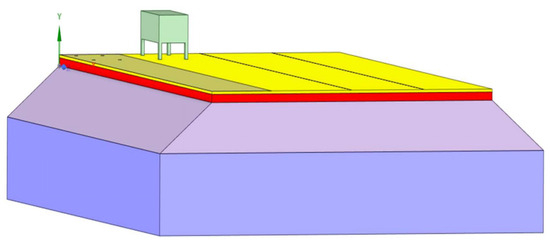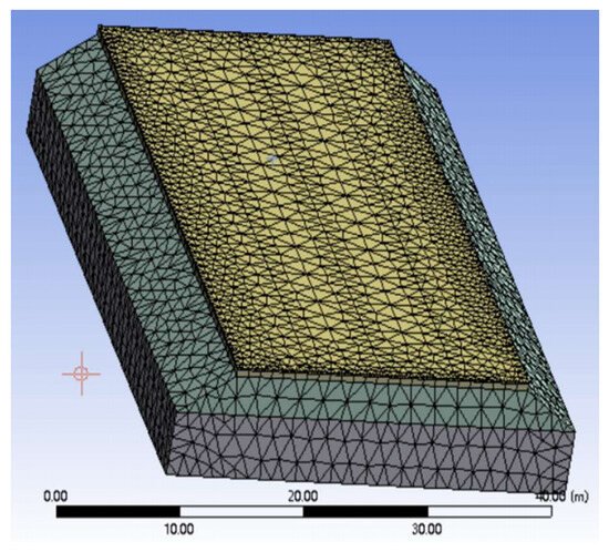 Based on the cross-section of the K49 + 534.7 section of the Chicao Expressway, a finite element model was constructed using ANSYS 2020R2 (Figure 7). In this model, the surface layer thickness is set to 0.18 m, the base layer thickness is 0.56 m, the roadbed soil layer thickness is 3 m, and the underlying foundation soil layer thickness is 5 m. In the xoy coordinate system, the road structure is 25.24 m wide and the upper and lower surface lengths of the roadbed are 25.24 m and 30 m, respectively, forming a slope ratio of 1:1.5. The model has spring damper boundaries on both sides, a completely fixed bottom boundary, and a top boundary representing a free surface with load pressure.