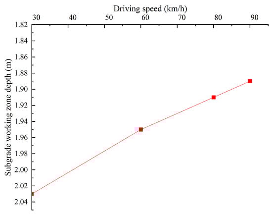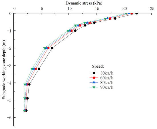 Based on Figure 9 and Figure 10 and Table 7, when the vehicle moves at a constant speed, the dynamic stress gradually decreases with increasing subgrade depth. As the driving speed increases, the dynamic stress decreases to varying degrees, with reductions of 6.2% and 5.2% observed at the surface and within 6 m below the surface, respectively. Figure 11 shows that as the driving speed increases, the depth of the affected subgrade region slightly decreases, but this change is not significant. Thus, under high-speed conditions (90 km/h), due to the shallow impact depth, the roadbed thickness can be reduced, and the drainage layer can be strengthened to guide actual engineering.