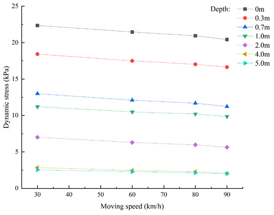 The speed of a vehicle affects its dynamic stress on the road surface, which is manifested in the duration of contact between the vehicle and the road surface. The shorter the contact time, the faster the vehicle speed. The test results are shown in Table 7, where the stress range is the 90% confidence interval of 100 simulated load cycles at each vehicle speed. By combining finite element analysis with on-site measured data, the relationship between dynamic stress and depth at different vehicle speeds was obtained, as shown in Figure 9. The finite element simulation average of 50 load cycles at each vehicle speed was obtained to determine the relationship between dynamic stress and driving speed at different depths, as shown in Figure 10. Simulate the dynamic stress distribution at different depths under four different vehicle speeds, and obtain the attenuation law of dynamic stress with roadbed depth under different vehicle speeds, as shown in Figure 11.