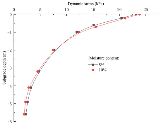 Control the moisture content parameters at 8% and 10%, representing the typical allowable range for roadbed compaction. In practical engineering, if the soil is too dry or too wet, it can be treated by watering and adding 3–5% quicklime. The corresponding shear strengths obtained from the triaxial tests were 22.4 kPa, 32.5° and 18.7 kPa, 33.4°, respectively. A standard driving speed of 60 km/h was applied, while the other parameters remained constant. Figure 12 and Figure 13 illustrate the variation of dynamic stress with depth and the displacement changes along the driving lane direction under different moisture content conditions under simulated vehicle loading. Table 8 presents the dynamic stress within 6 m below the subgrade surface under different moisture content conditions.