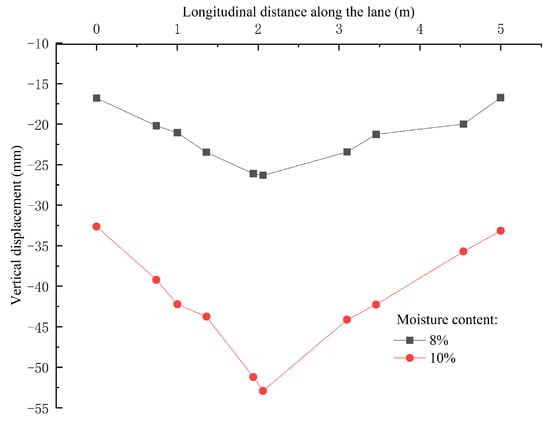 According to Figure 12 and Table 8, the dynamic stress decreases with increasing subgrade depth. For moisture contents of 8% and 10%, the dynamic stress decreases by 92.3% and 96.9%, respectively, from the surface to the bottom. At the load application point, the maximum dynamic stress occurs, with a difference of 2.1% between the 8% and 10% moisture content conditions. Figure 13 shows that the maximum vertical displacement is located at the top of the roadbed. As the moisture content increases, the cohesive force of the alluvial silt decreases. When the moisture content increases from 8% to 10%, the maximum displacement at the top increases by 104.8%. This is because the dynamic load under wetter conditions will produce significantly higher pore water pressure, reduce effective confining pressure, and accelerate deformation. This indicates that a high moisture content has a significant impact on the mechanical behavior of shallow areas. Although the optimal moisture content (7.8%) is close to the plastic limit (8.4%), on-site data show that the roadbed is stable when the compaction degree is greater than 94%. After construction, it is necessary to monitor the moisture content to prevent it from exceeding the plastic limit in order to avoid a decrease in strength.